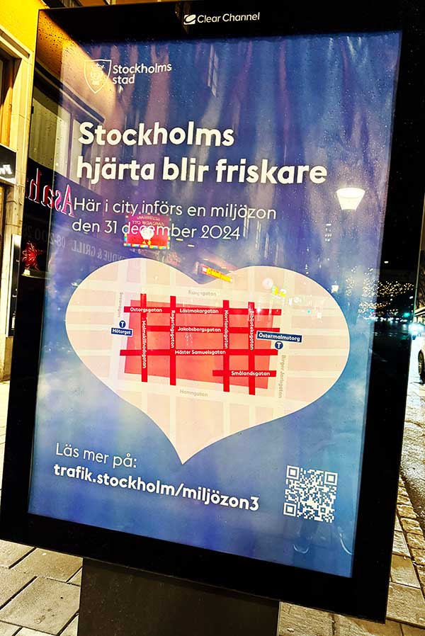 I en stor affischkampanj har Stockholms stad under hösten gått ut med att miljözon 3 ska införas. Nu är den zonen skjuten på framtiden. Foto: Ulo Maasing.