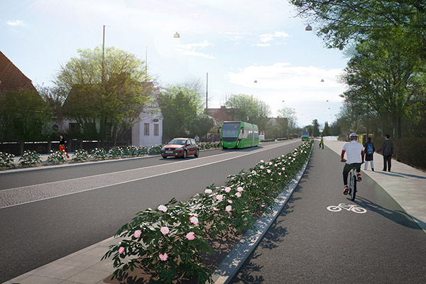 Så är det tänkt att Erikslustvägen i Malmö ska se ut när trafiken med MalmöExpressen 4 startar. Men nu råder byggkaos… Visionsbild: Sweco.