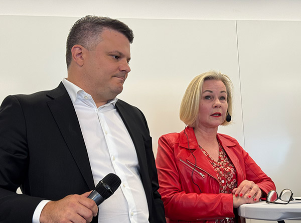 Zakaria Amna-Aissa, direktör kommersiell trafik på Vy Buss och Sveriges Bussföretags Anna Grönlund efterlyste mer samverkan mellan skattefinansierad och kommersiell kollektivtrafik. Foto: Ulo Maasing.