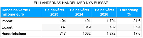 Kinas ställning på bussmarknaden i EU är på samma sätt underskattad i statistiken för nya bussar. Exempelvis BYD har produktion i Ungern och Frankrike. De bussar som rullar ut från fabrikerna där är ju redan inom EU. Handeln med nya bussar mellan EU och omvärlden framgår av tabellen nedan som bygger på siffror från ACEA.