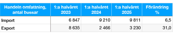 Samtidigt ökade de nyregistrerade laddbara bussarna sin marknadsandel från 16,4 procent under det första halvåret 2024 till 21,6 procent i år. Hybridbussarna minskade kraftigt till endast 6,9 procent av marknaden medan batteridrivna bussar ökade till 21,6 procent av marknaden. Dieselbussarna (inklusive biodiesel) minskade sin marknadsandel till 64,7 procent av marknaden. Gas- och bränslecellsbussarna hade tillsammans 6,9 procent av marknaden.