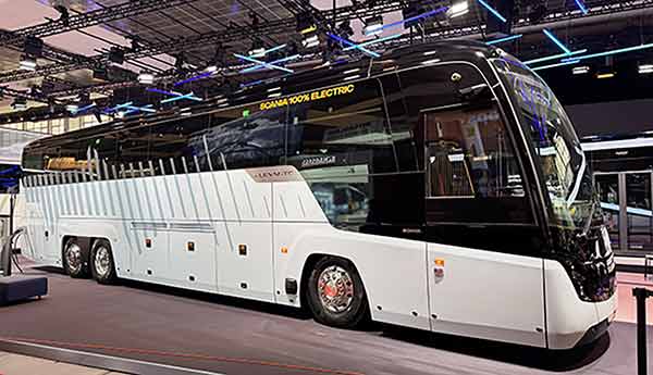 Scania visade på Busworld bland annat en batteridriven turistbuss med höggolv och kaross från CaetanoBus. Den utställda bussen var byggd för vänstertrafik. Foto: Ulo Maasing.