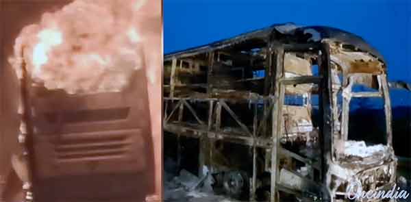 Minst 20 personer omkom i en bussbrand i Indien på fredagen. Bilden ur en video från OneIndia News. Vi länkar till videon längst ner i artikeln.