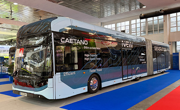 Portugisiska Caetano visade bland annat en eldriven BRT-buss med dörrar på båda sidor. Liksom Caetanos övriga stadsbussar kommer plattformen och en stor del av karossen från kinesiska CRRC. Foto: Ulo Maasing.