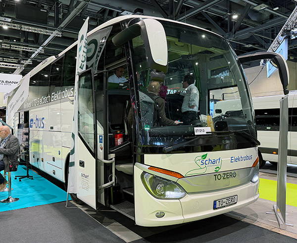Bland de utställda bussarna fann vi också en katt bland hermelinerna – en buss med omisskännlig Setradesign men utan namnet Setra i nosen. Det var det tyska företaget To Zero som hade konverterat bussen till batteridrift och utlovade korta leveranstider, en räckvidd om 400 kilometer på en laddning och 100 kilometer på 30 minuters laddning samt åtta års garanti på batterierna.